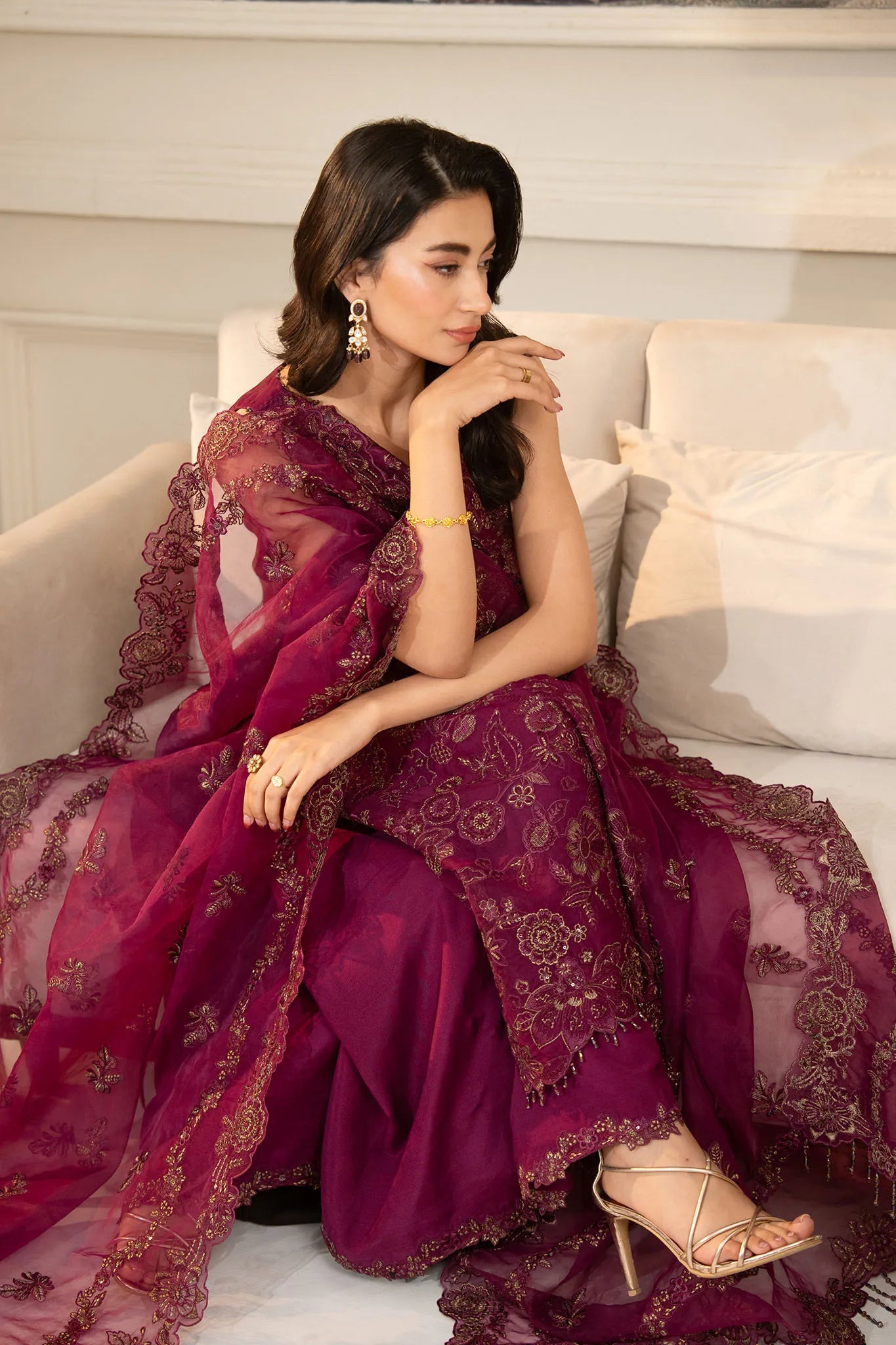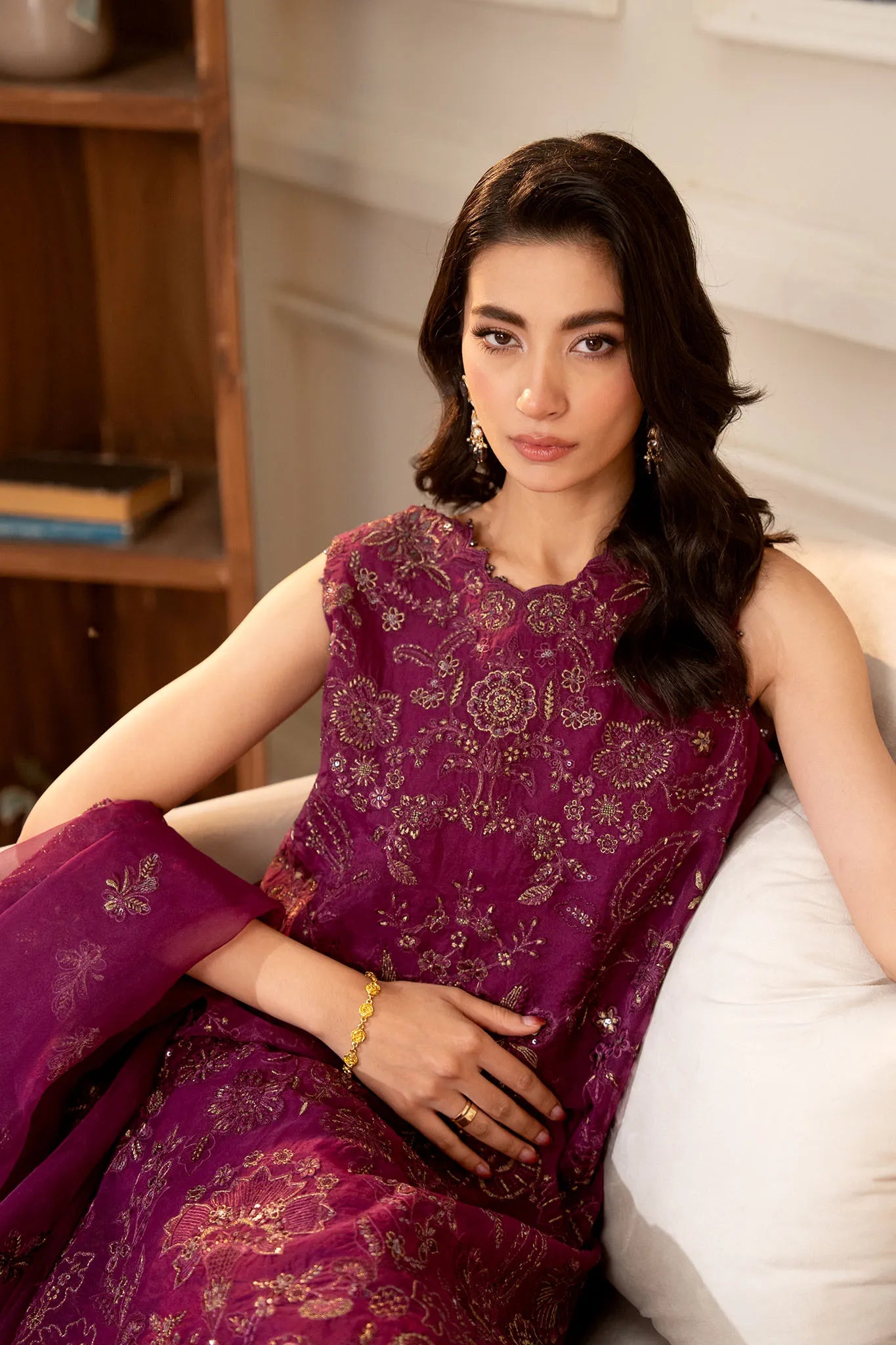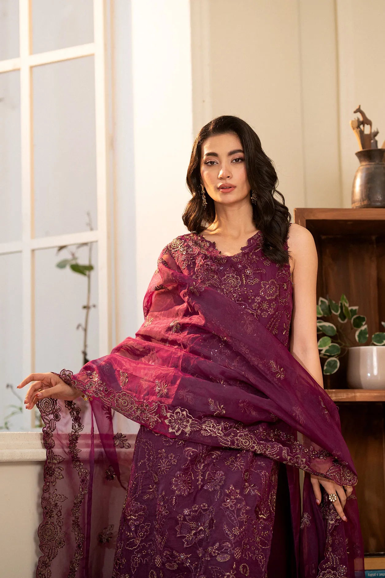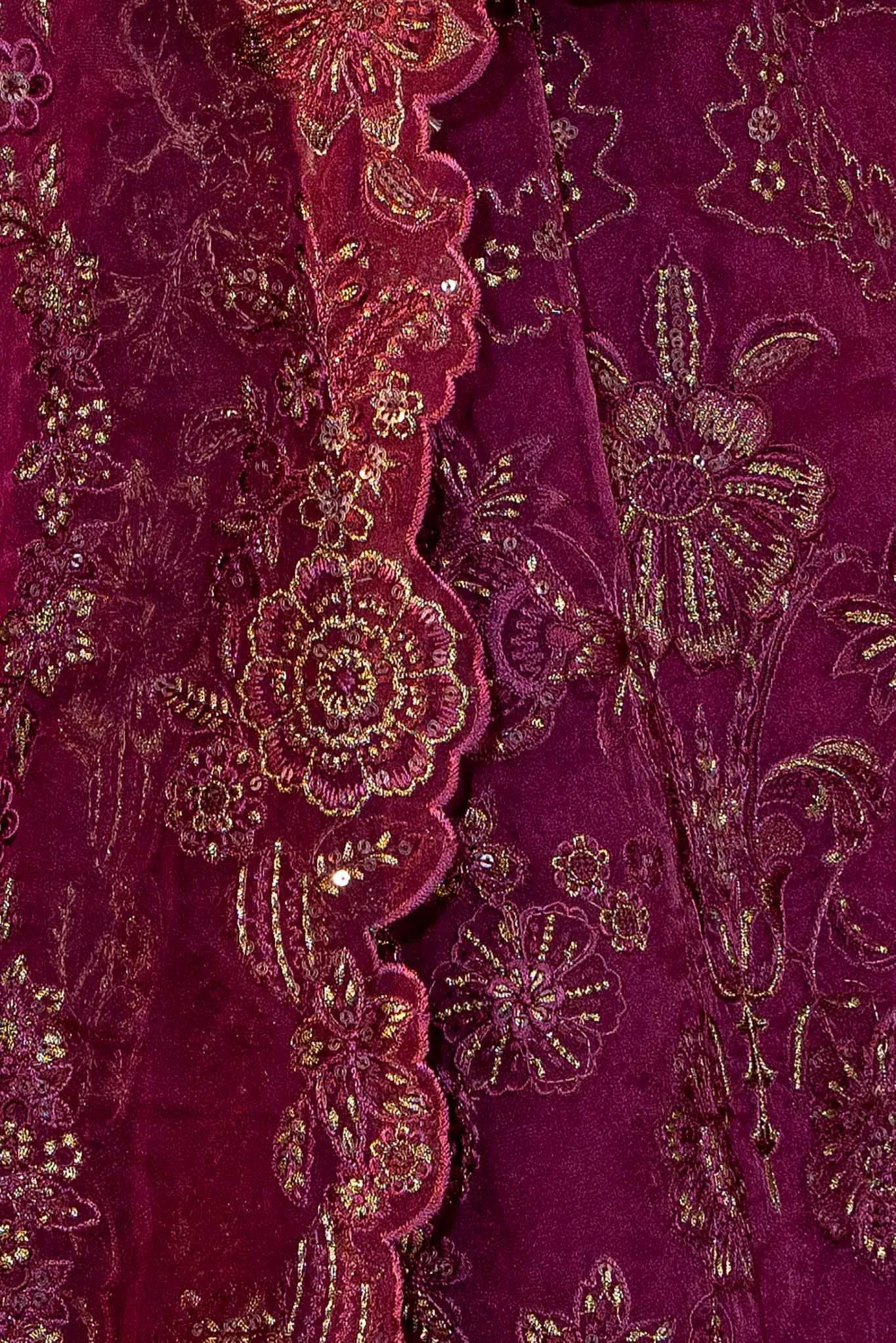 Berryglow—a vision of regal opulence, where luxury meets enchantment in the deepest hues of amethyst. Drenched in a rich, velvety purple, this masterpiece echoes the mystique of precious gemstones, captivating with its depth and brilliance. Intricate golden threadwork and delicate bead embellishments weave an artful symphony across the fabric, each detail a testament to unparalleled craftsmanship. The sleeveless silhouette exudes refined allure, while a sheer dupatta, adorned with ethereal floral motifs and scalloped edges, drapes effortlessly, adding an air of poetic grace. Designed for evening affairs and grand celebrations, Berryglow is the embodiment of sophistication and regal glamour—an unforgettable statement of power and elegance.