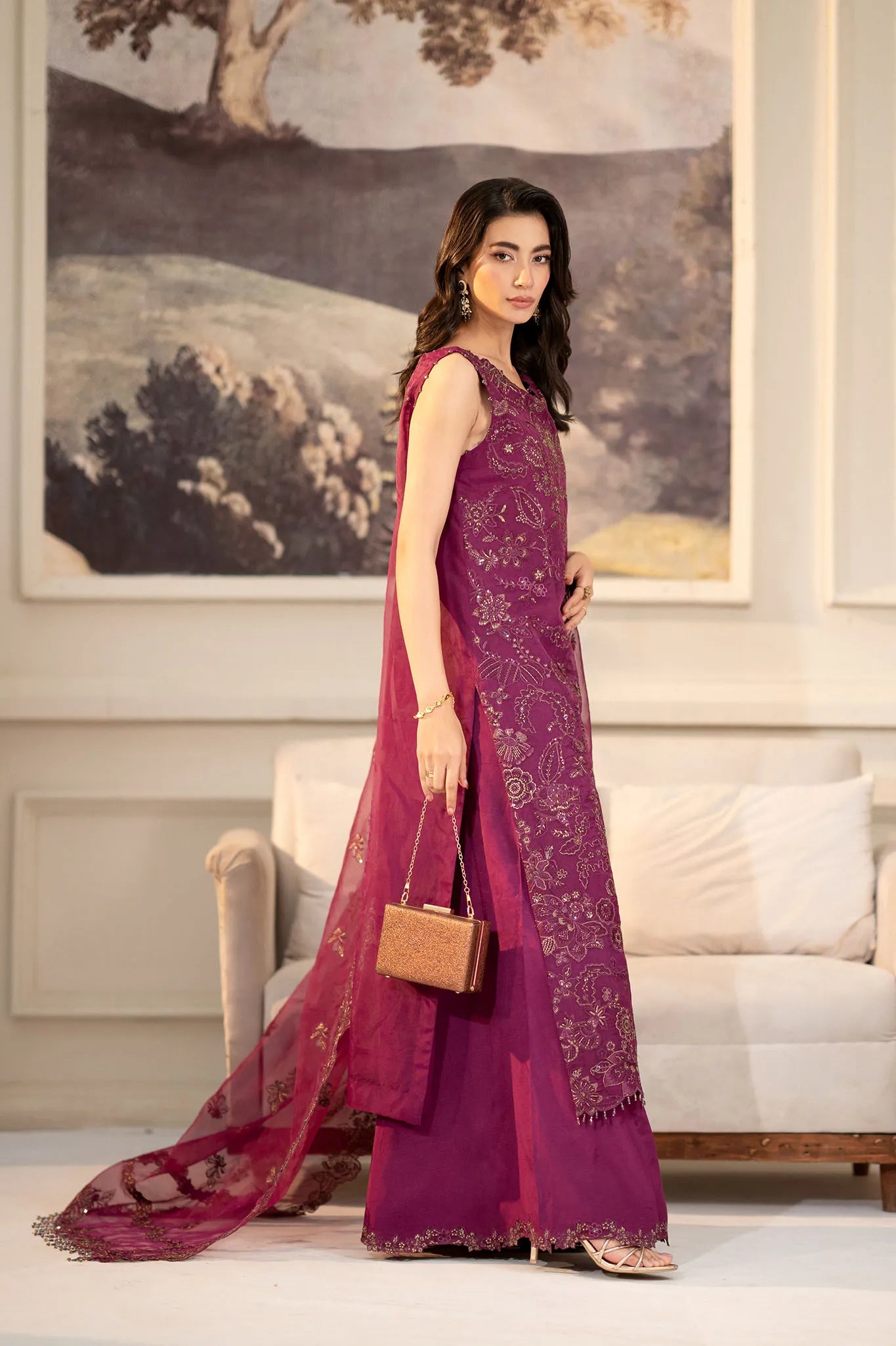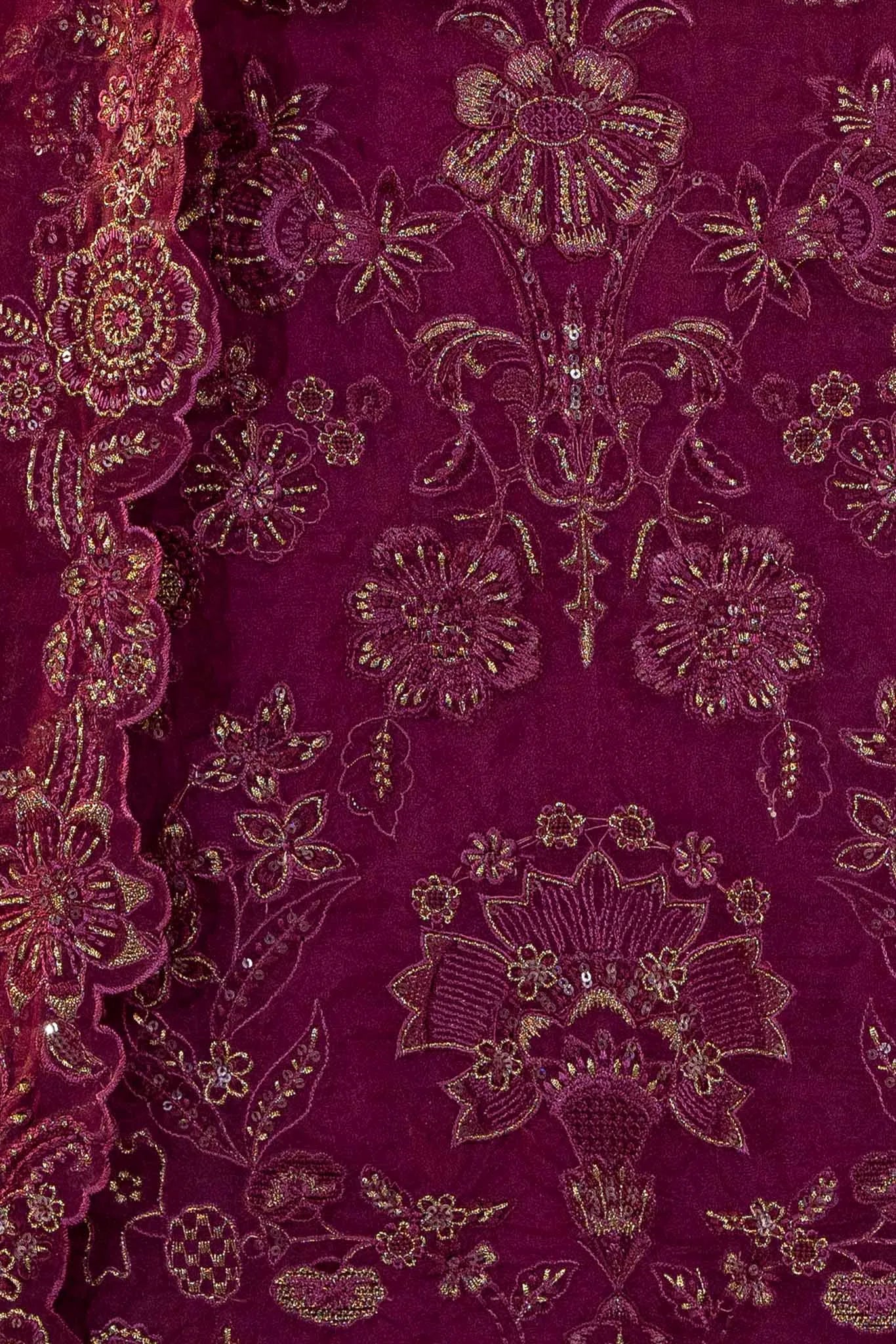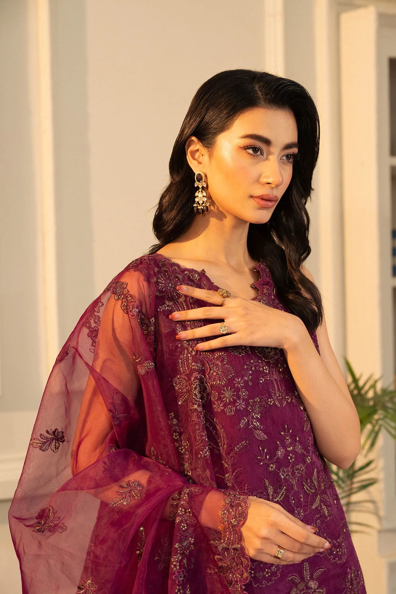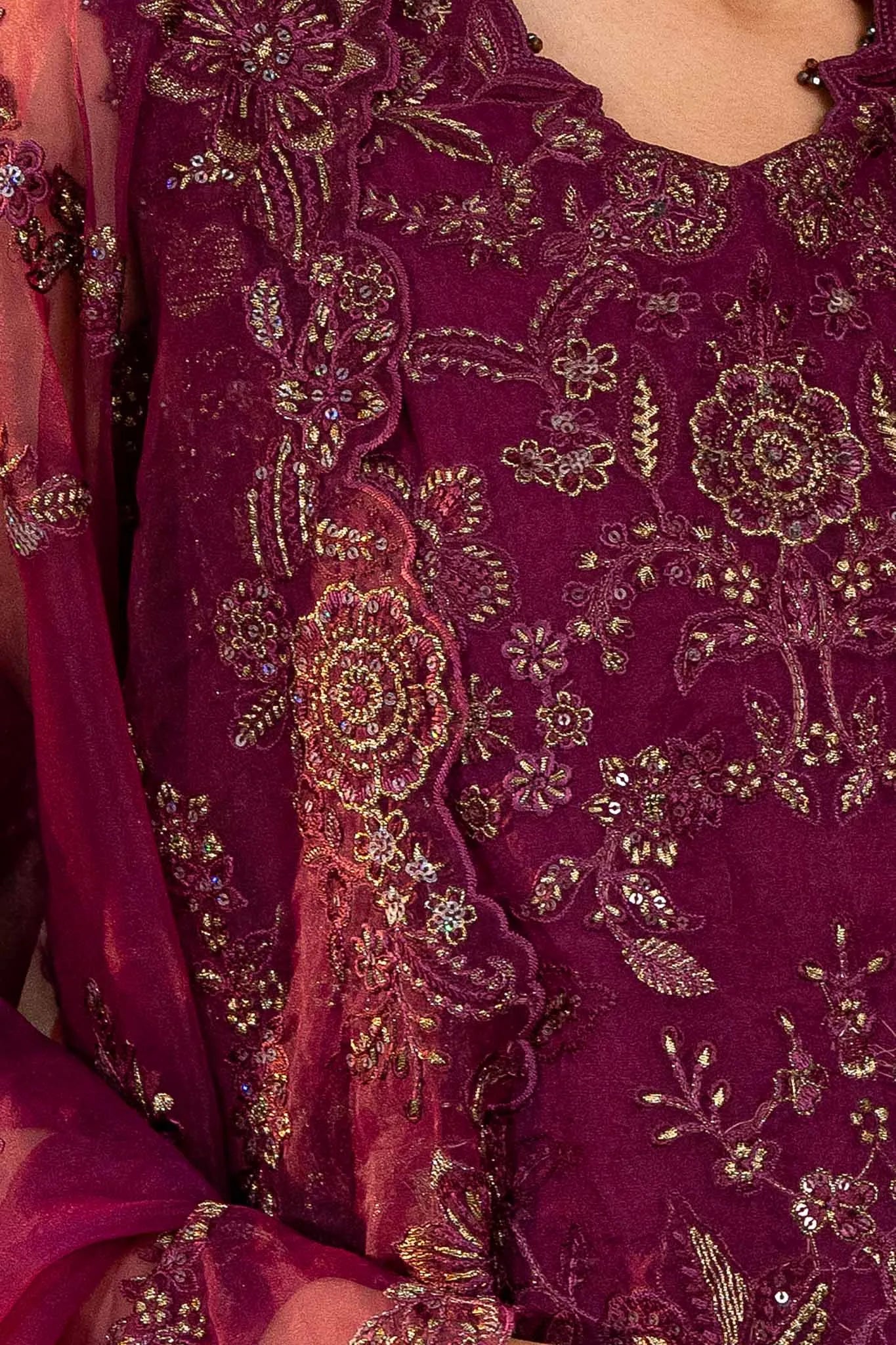 Berryglow—a vision of regal opulence, where luxury meets enchantment in the deepest hues of amethyst. Drenched in a rich, velvety purple, this masterpiece echoes the mystique of precious gemstones, captivating with its depth and brilliance. Intricate golden threadwork and delicate bead embellishments weave an artful symphony across the fabric, each detail a testament to unparalleled craftsmanship. The sleeveless silhouette exudes refined allure, while a sheer dupatta, adorned with ethereal floral motifs and scalloped edges, drapes effortlessly, adding an air of poetic grace. Designed for evening affairs and grand celebrations, Berryglow is the embodiment of sophistication and regal glamour—an unforgettable statement of power and elegance.