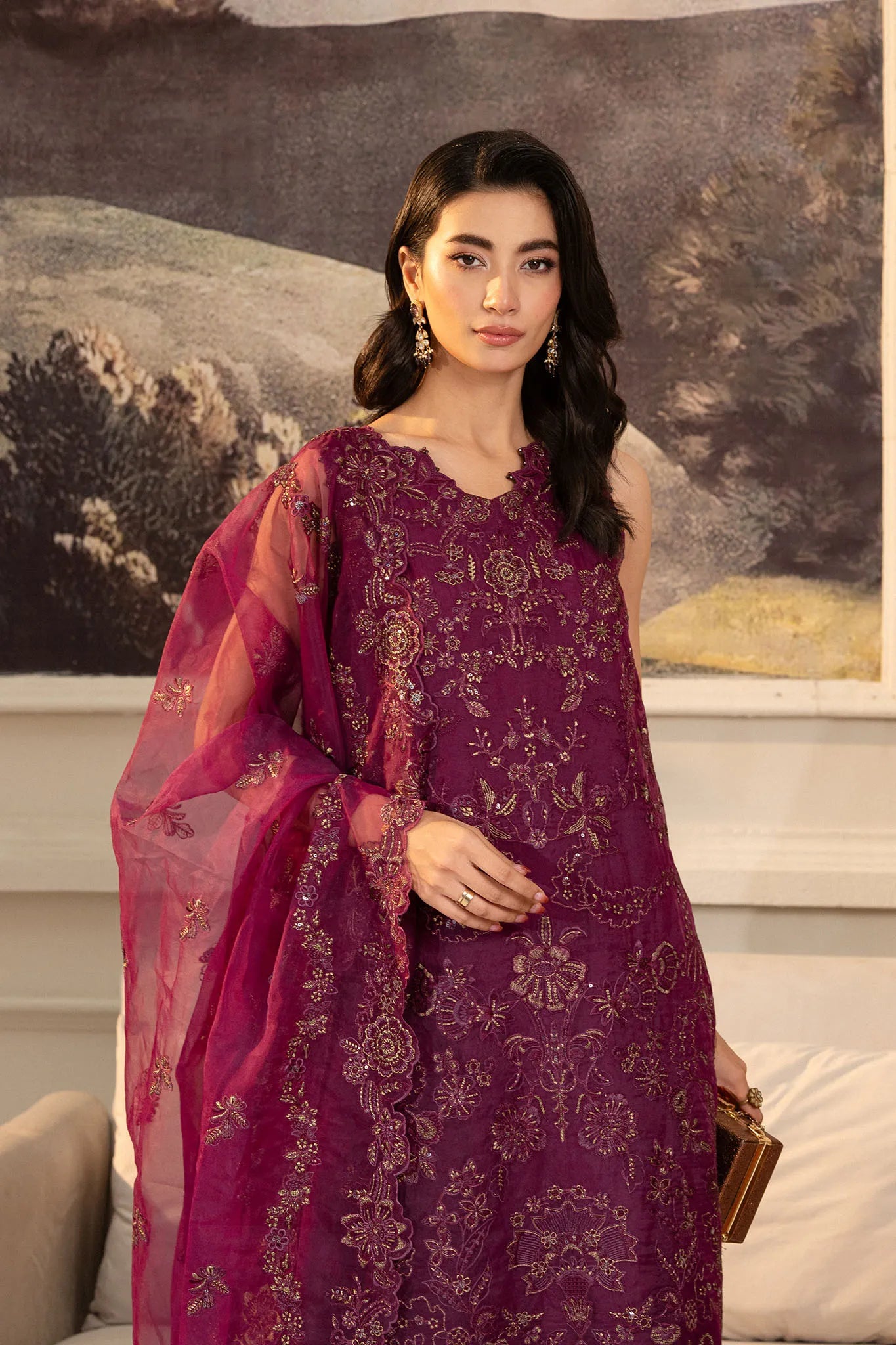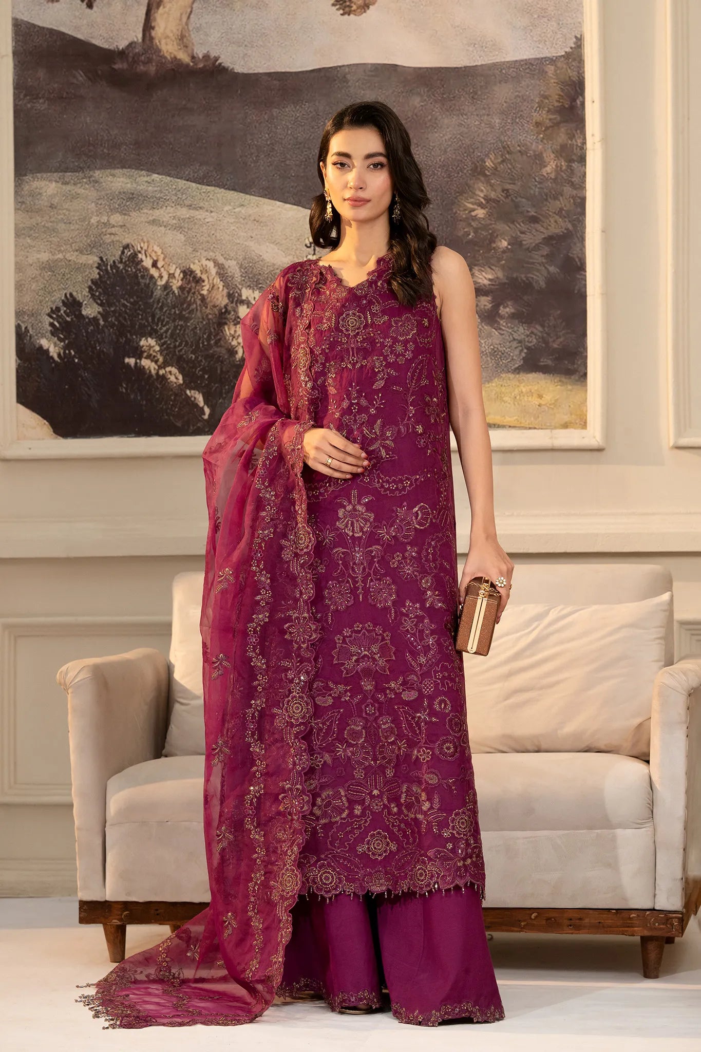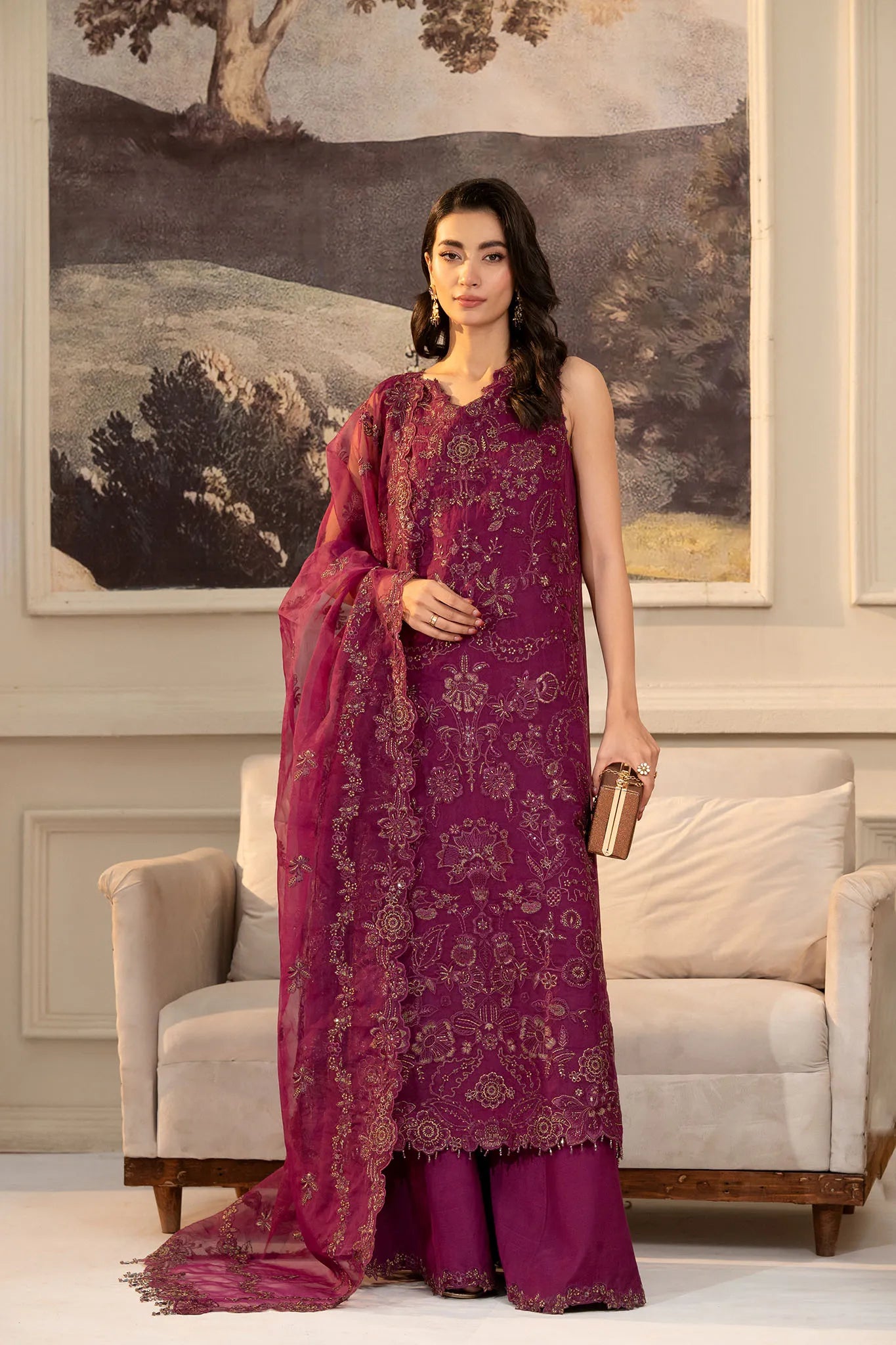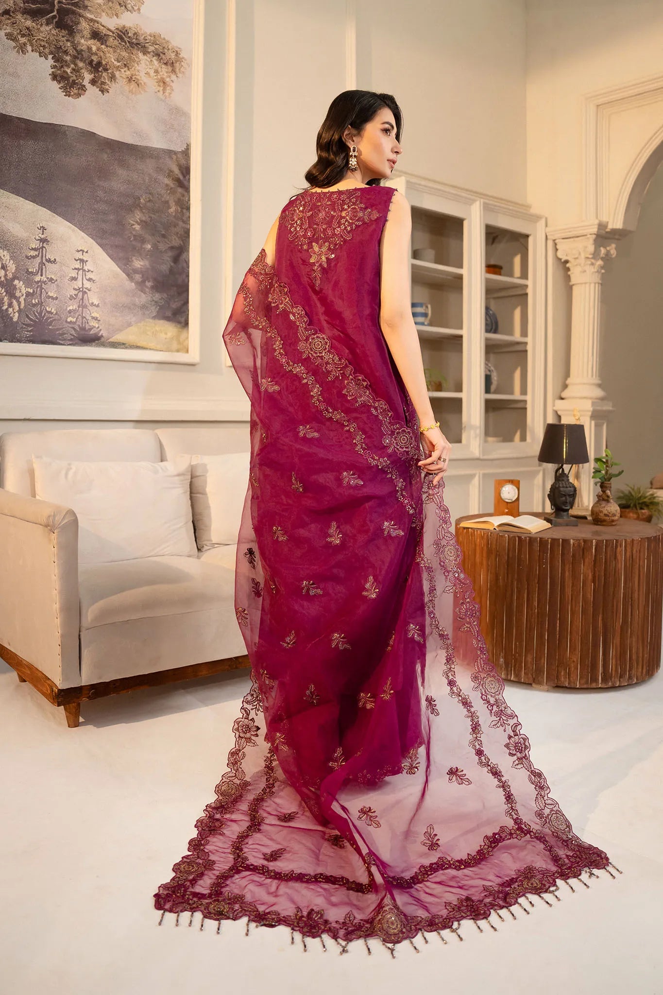 Berryglow—a vision of regal opulence, where luxury meets enchantment in the deepest hues of amethyst. Drenched in a rich, velvety purple, this masterpiece echoes the mystique of precious gemstones, captivating with its depth and brilliance. Intricate golden threadwork and delicate bead embellishments weave an artful symphony across the fabric, each detail a testament to unparalleled craftsmanship. The sleeveless silhouette exudes refined allure, while a sheer dupatta, adorned with ethereal floral motifs and scalloped edges, drapes effortlessly, adding an air of poetic grace. Designed for evening affairs and grand celebrations, Berryglow is the embodiment of sophistication and regal glamour—an unforgettable statement of power and elegance.