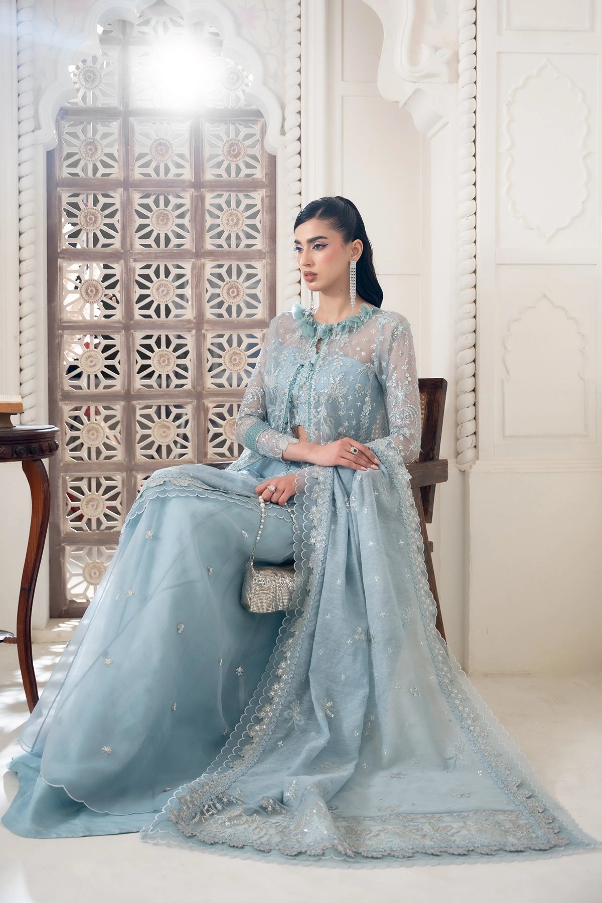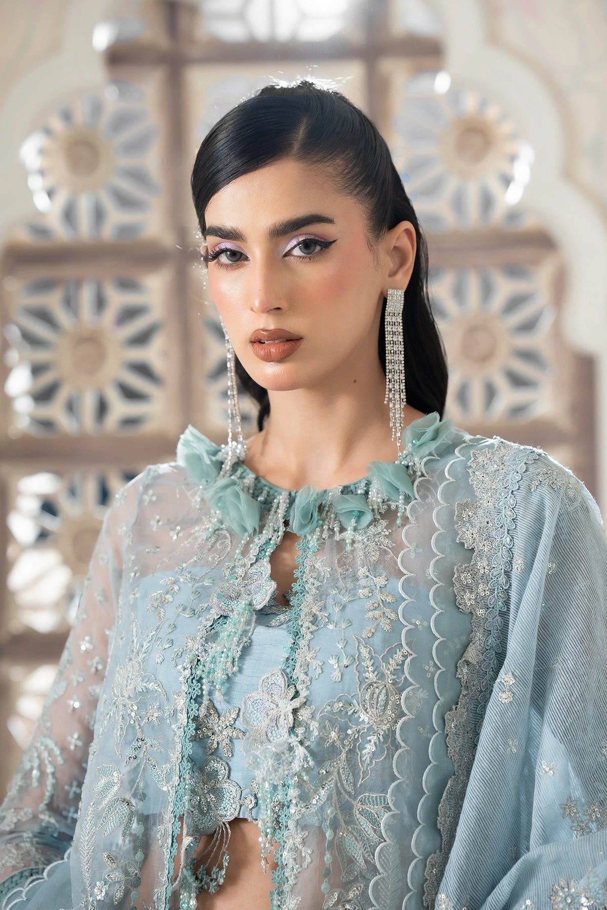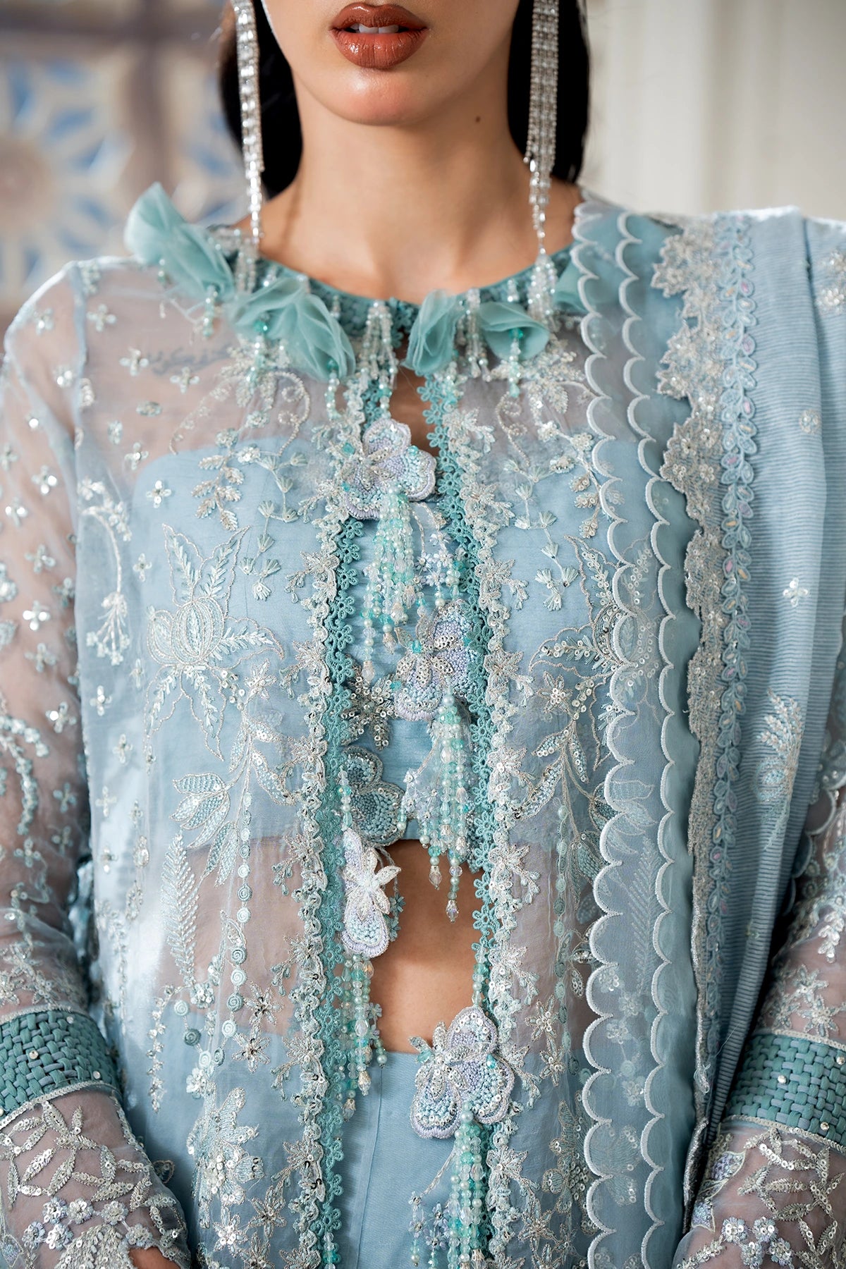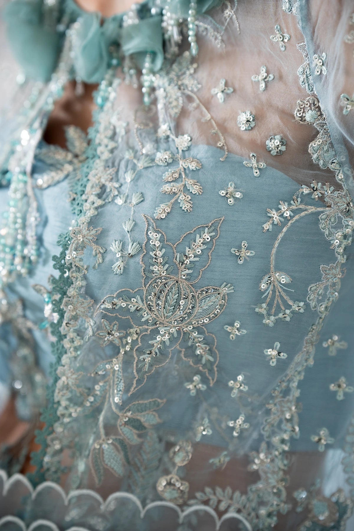 The sheer organza jacket in mist blue layers over a minimal base, with structured tailoring and subtle fabric textures. The manipulated panels add modern interest while keeping the overall look effortlessly refined.