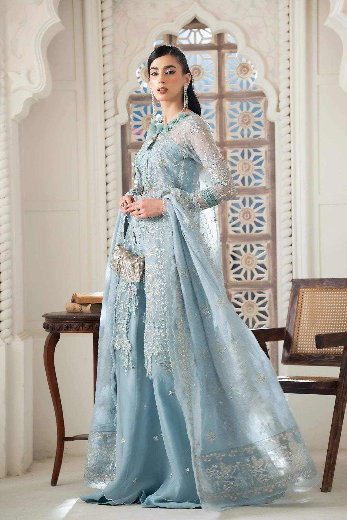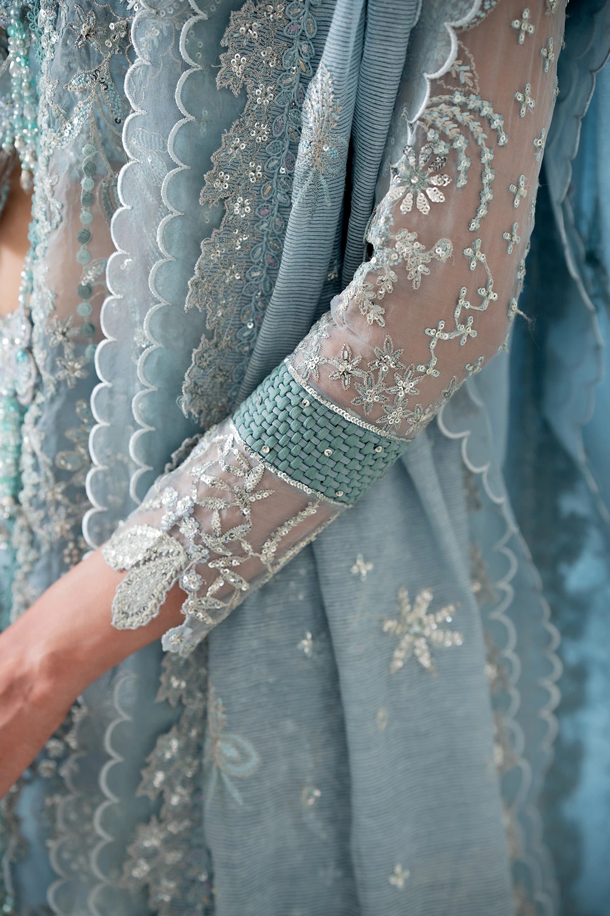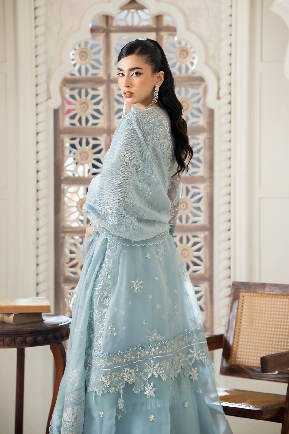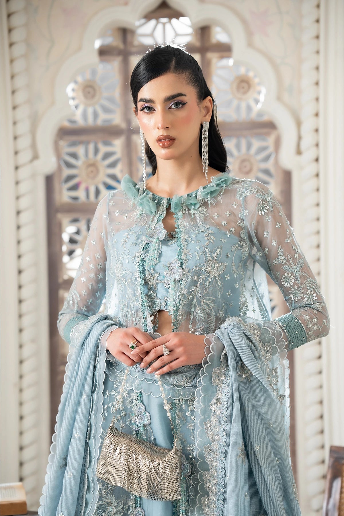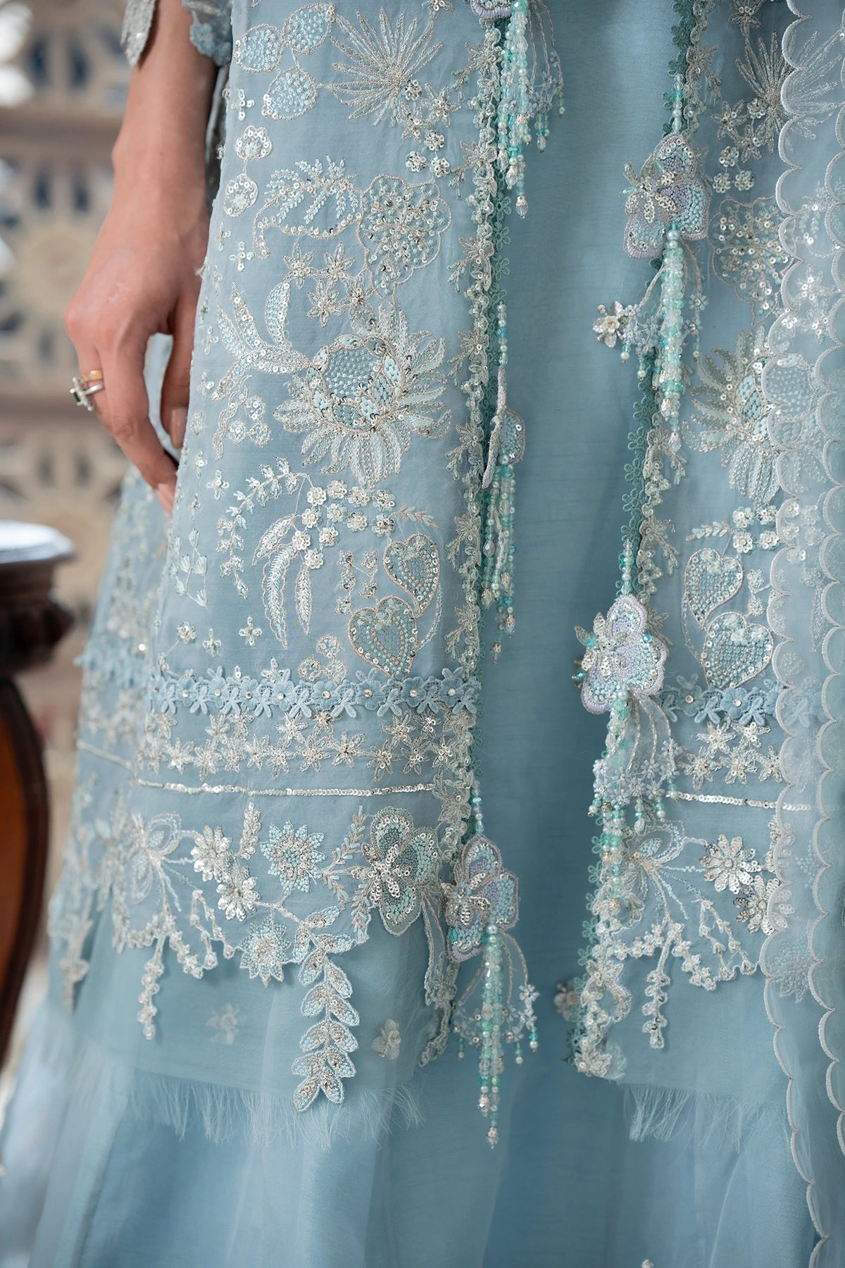 The sheer organza jacket in mist blue layers over a minimal base, with structured tailoring and subtle fabric textures. The manipulated panels add modern interest while keeping the overall look effortlessly refined.