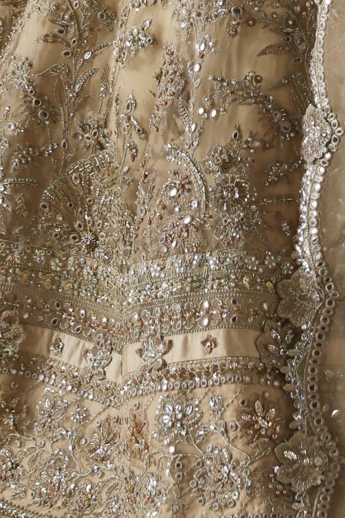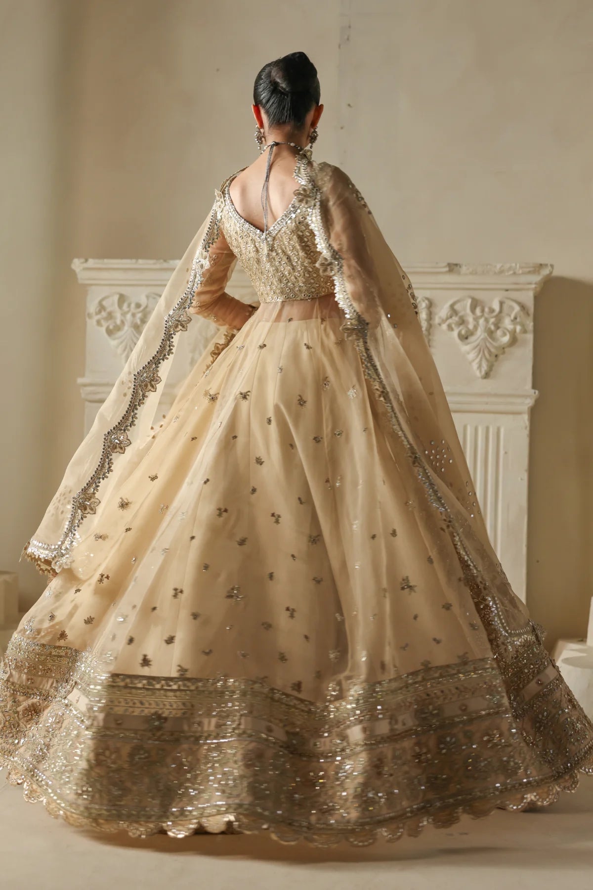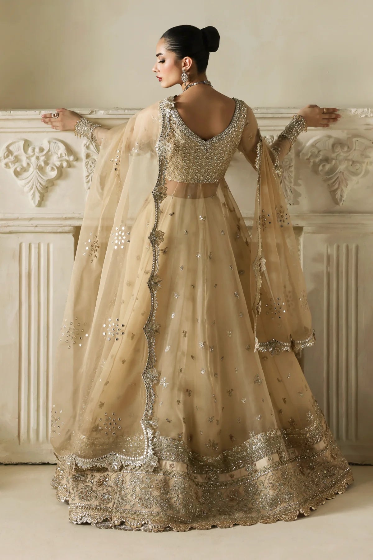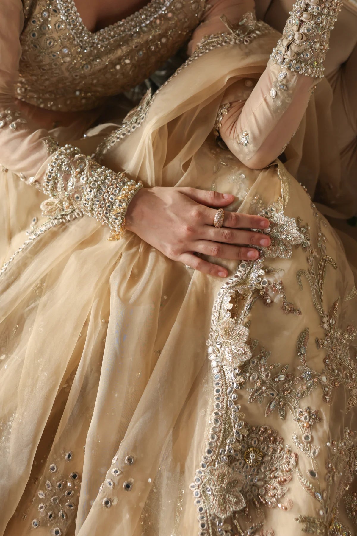 An opulent champagne-gold organza peshwaz that radiates luxury. Lined with smooth raw silk, it features shaded golden embroidery blended with silver Ganga Jamni work. Silver and gold stones are delicately hand-set, creating a luminous glow that captures the grandeur of wedding celebrations.