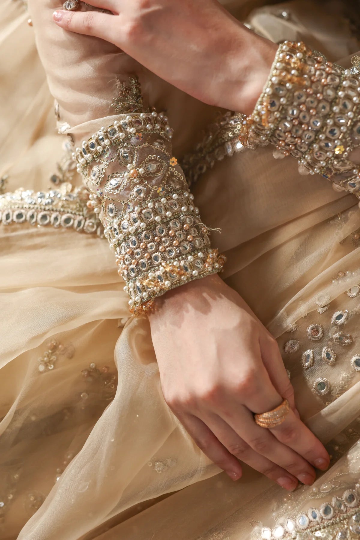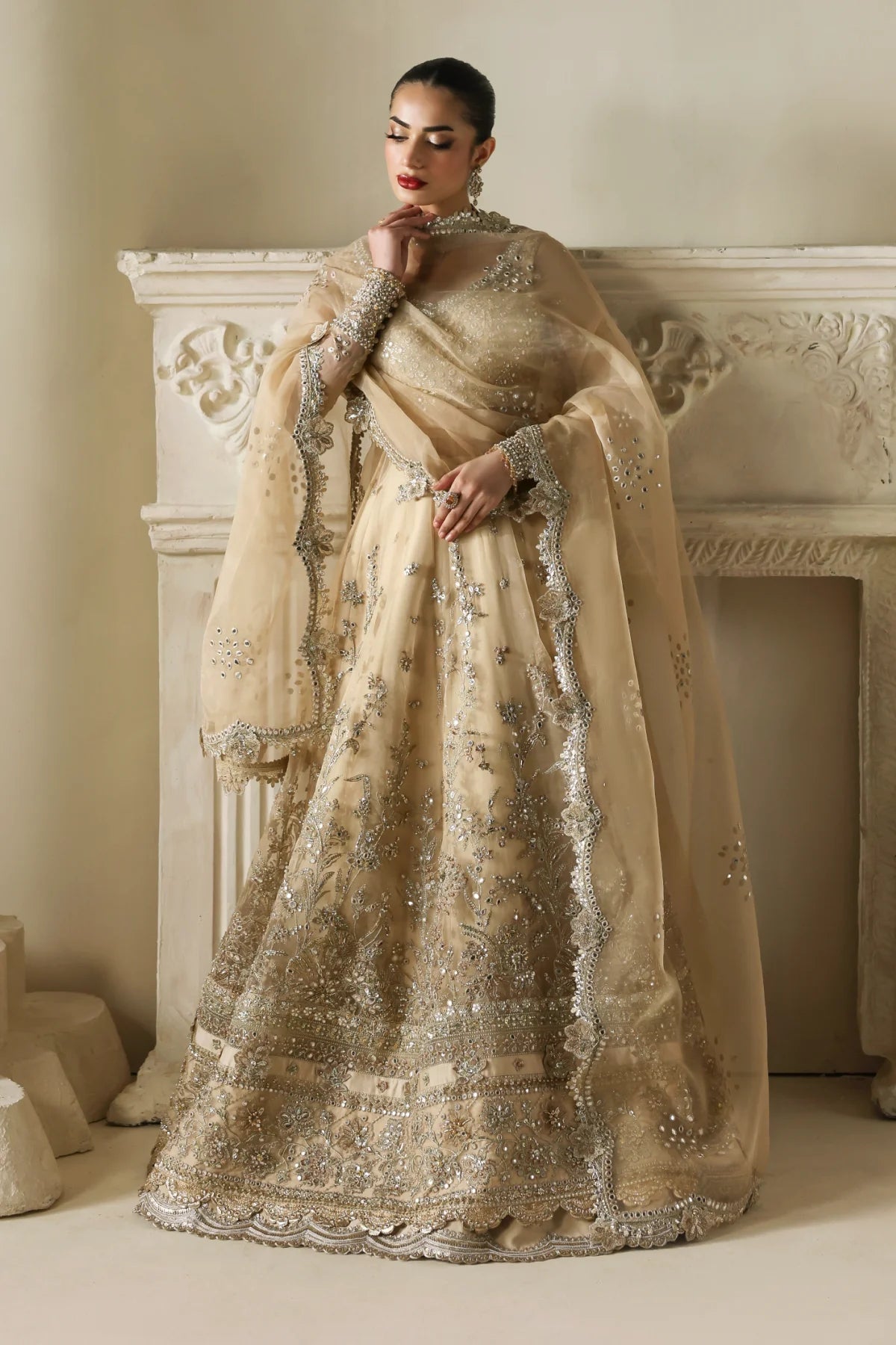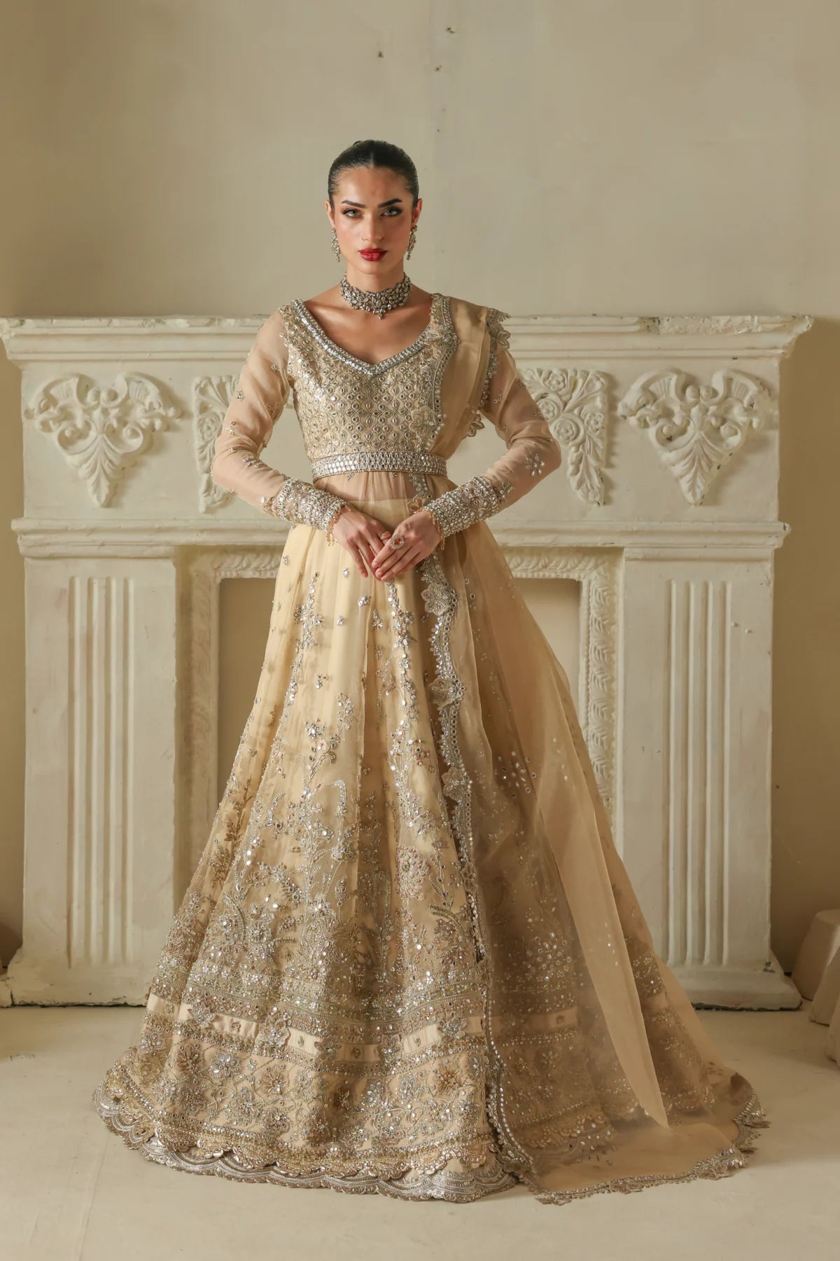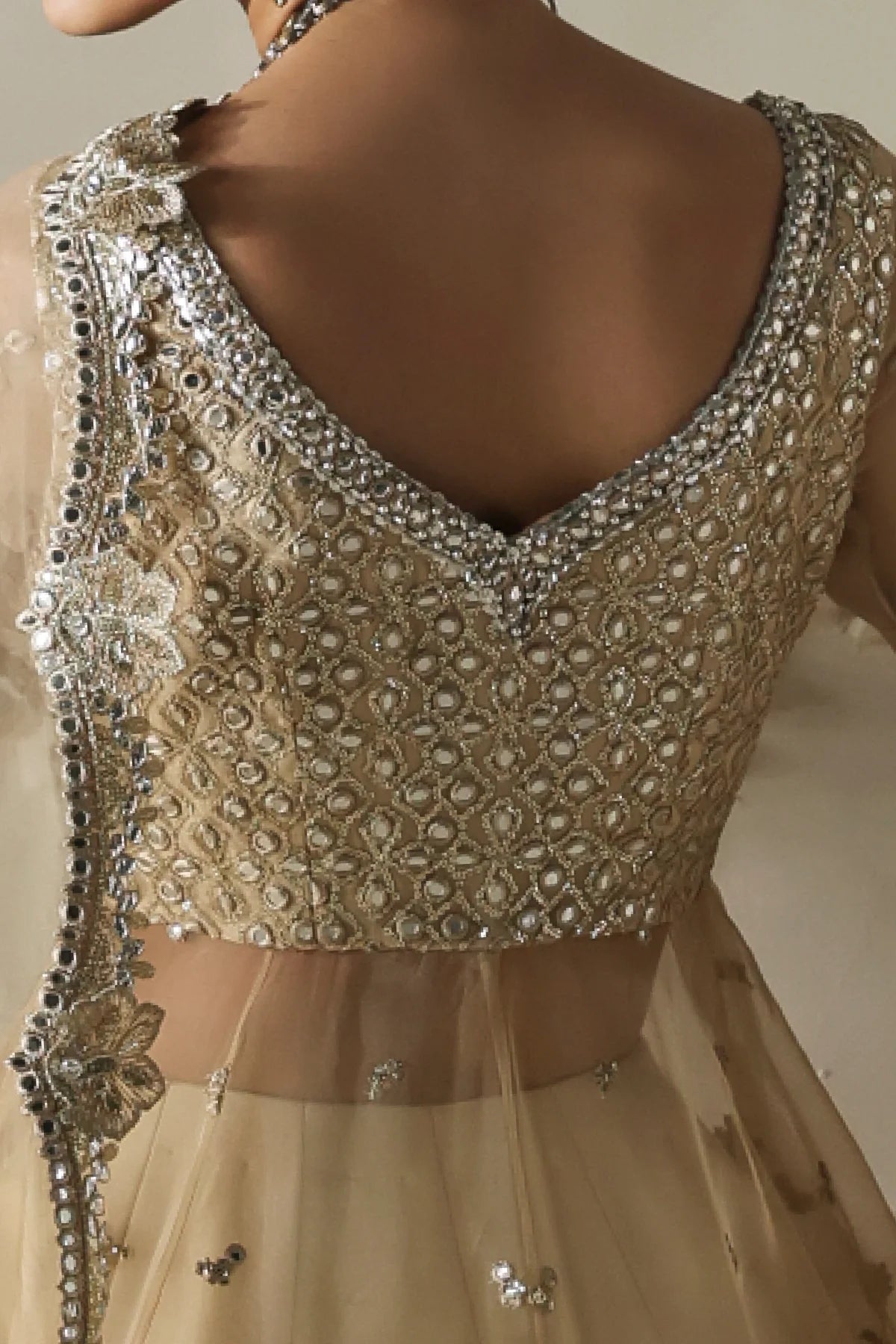 An opulent champagne-gold organza peshwaz that radiates luxury. Lined with smooth raw silk, it features shaded golden embroidery blended with silver Ganga Jamni work. Silver and gold stones are delicately hand-set, creating a luminous glow that captures the grandeur of wedding celebrations.