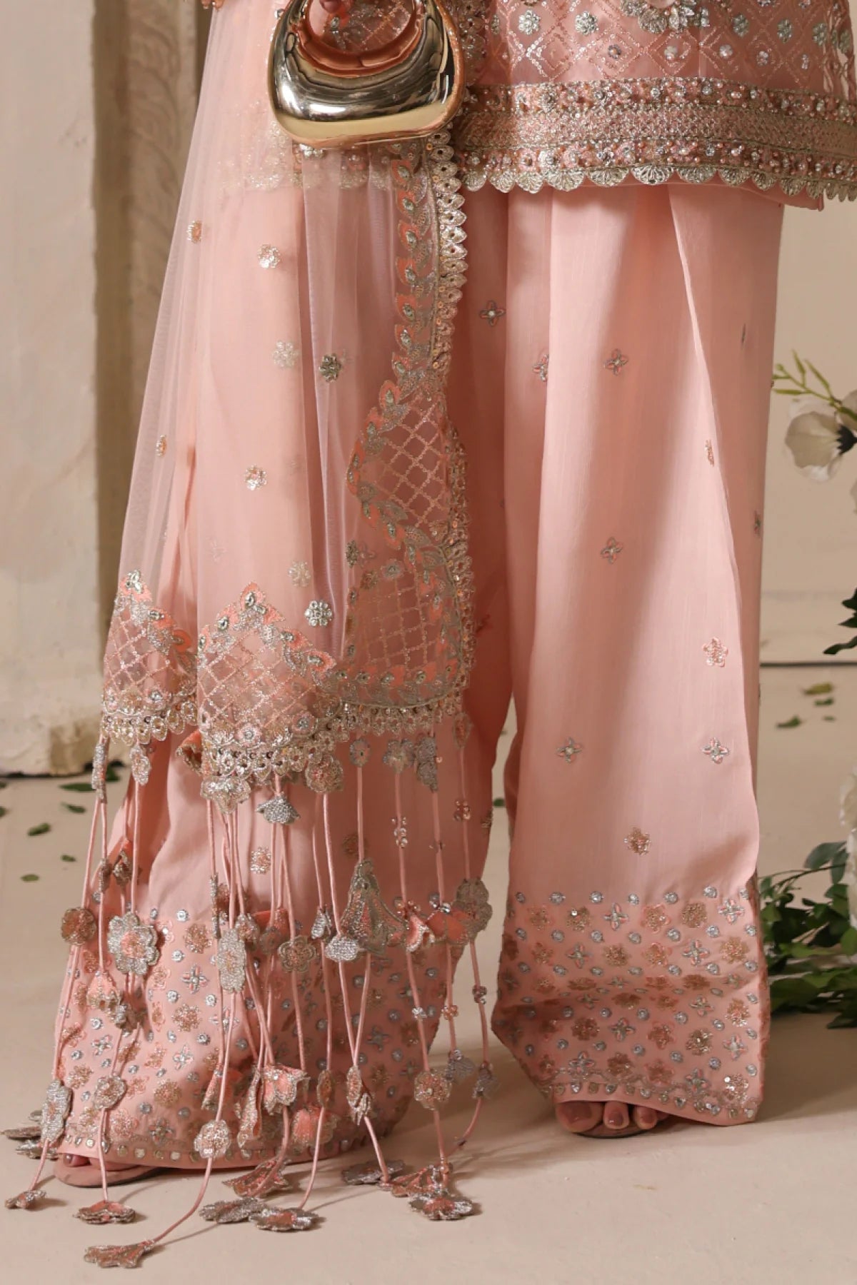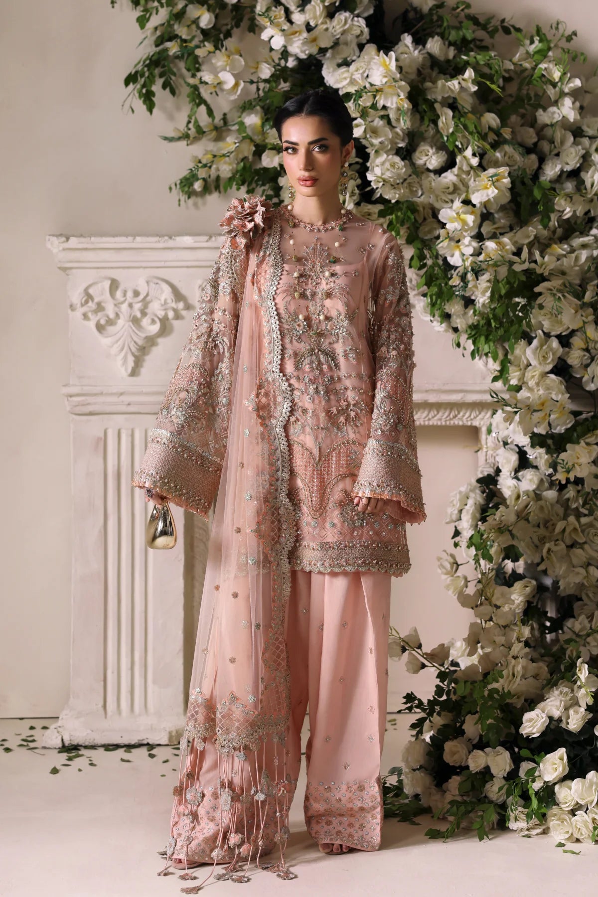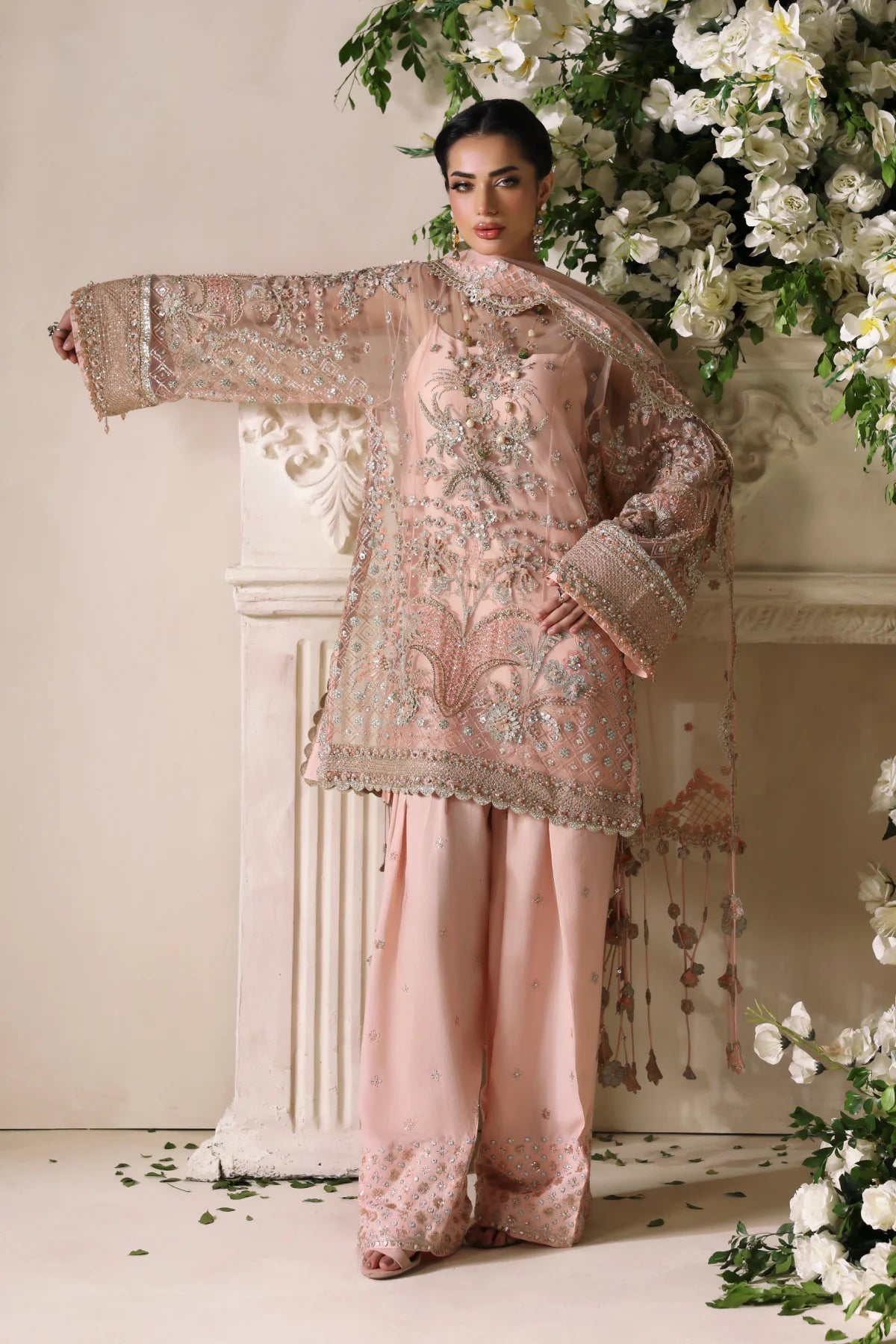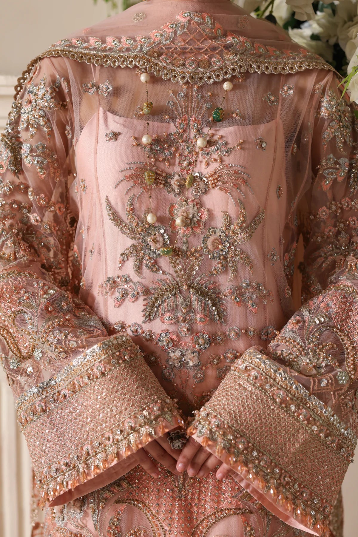 A regal peach net kurta paired with a flowing raw silk farshi shalwar. The kurta features shaded peach silk thread embroidery, complemented by intricate GangaJamni handwork in gold and silver. Sparkling stones are delicately placed to enhance its royal aura, creating a timeless piece that revives the grandeur of traditional wedding attire.