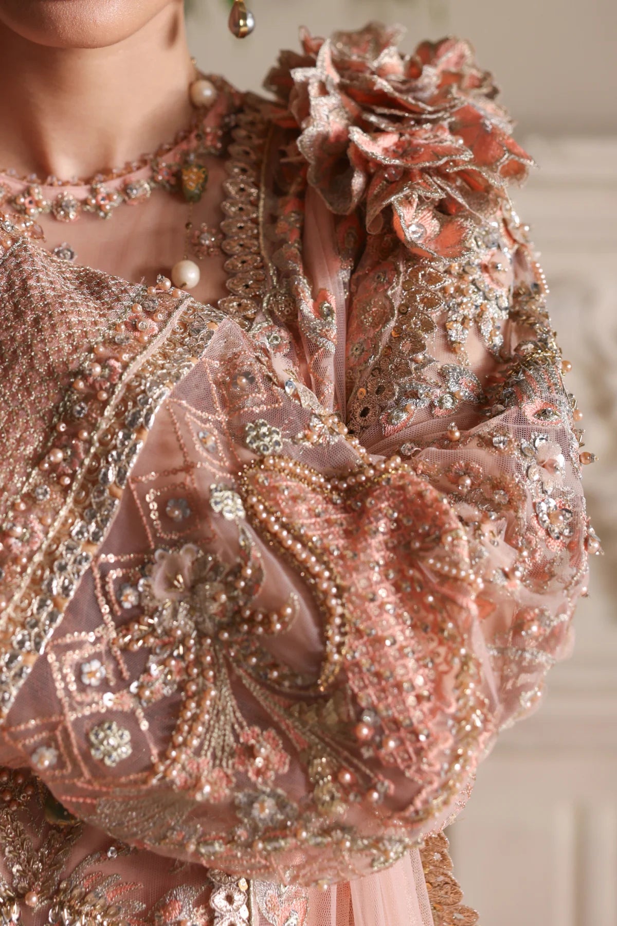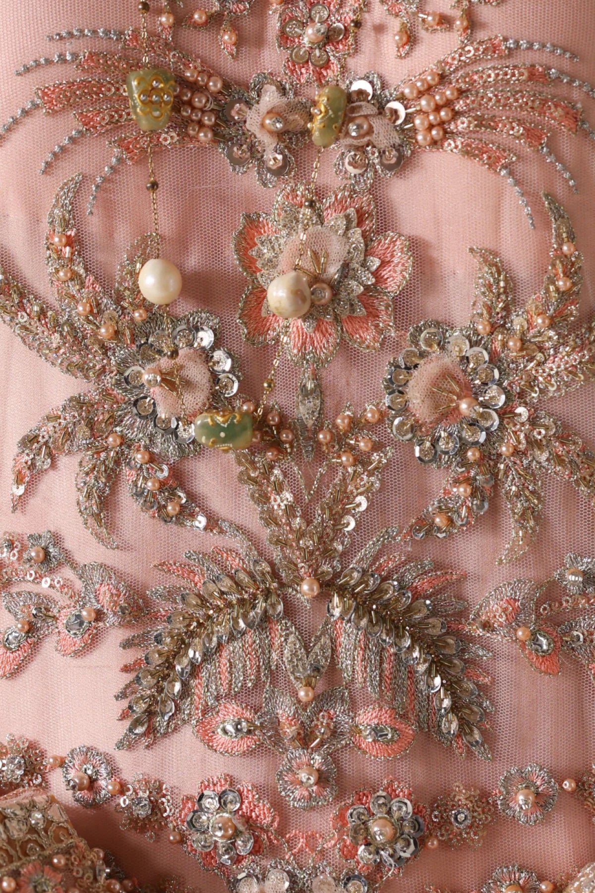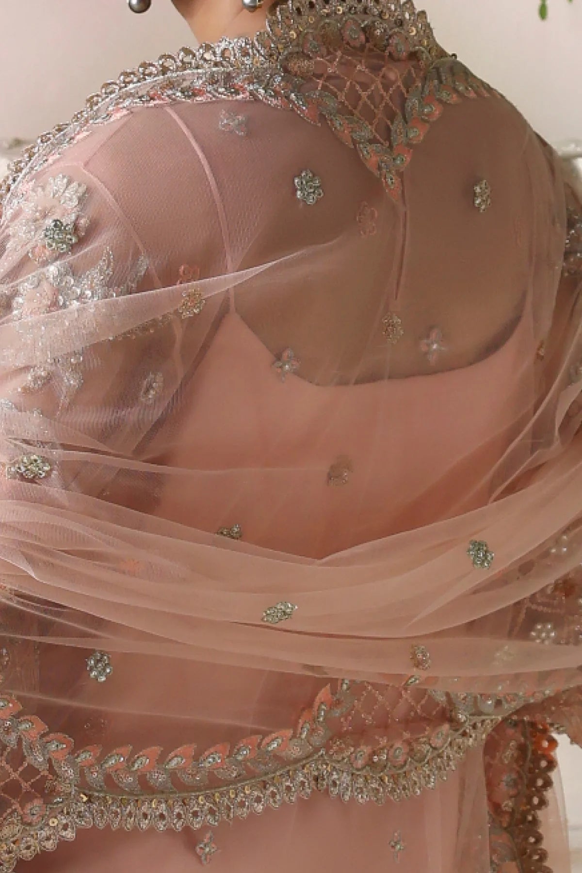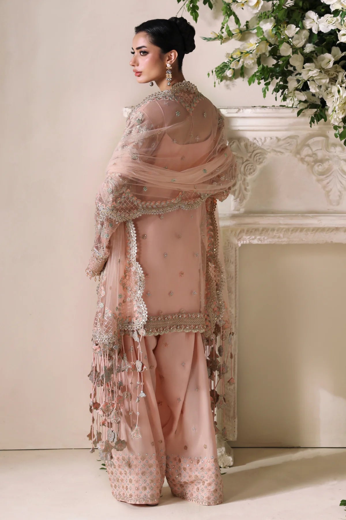 A regal peach net kurta paired with a flowing raw silk farshi shalwar. The kurta features shaded peach silk thread embroidery, complemented by intricate GangaJamni handwork in gold and silver. Sparkling stones are delicately placed to enhance its royal aura, creating a timeless piece that revives the grandeur of traditional wedding attire.