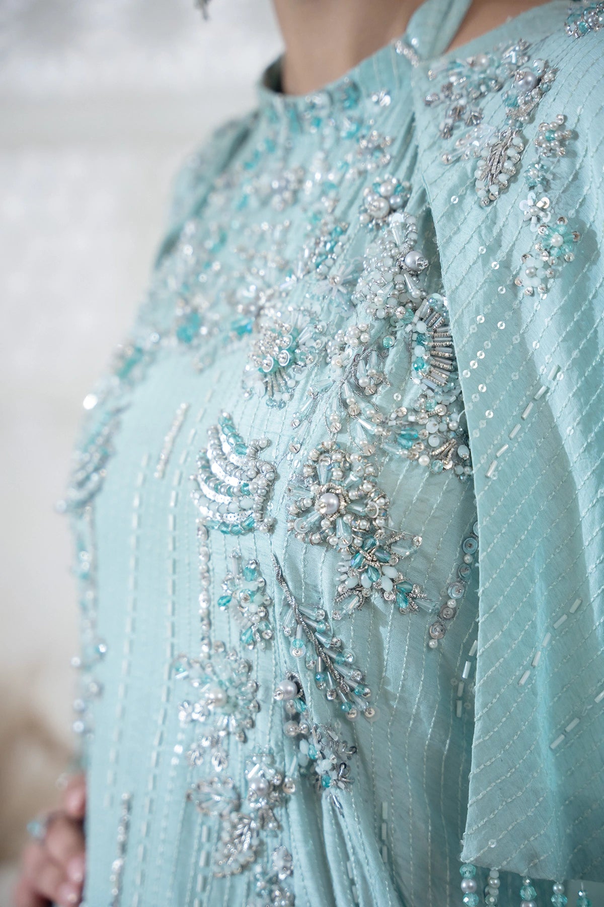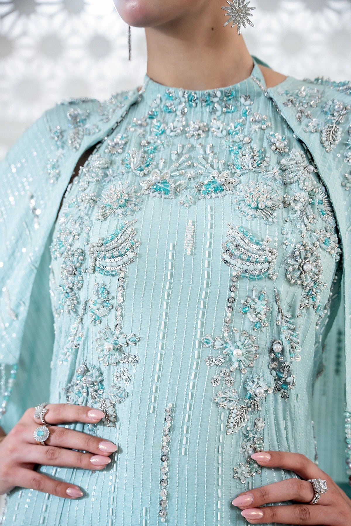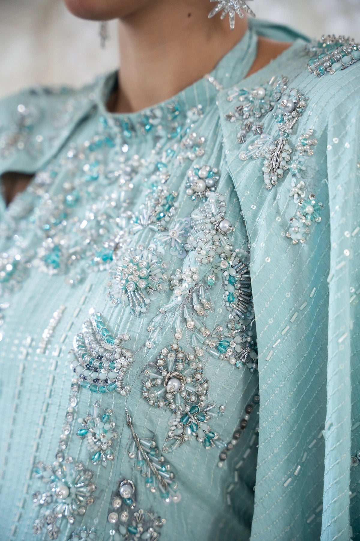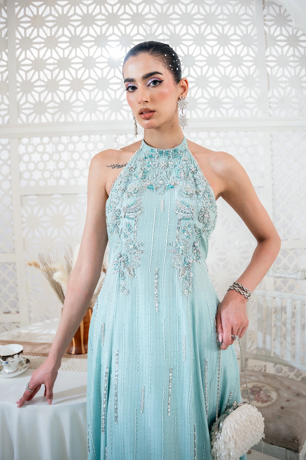 This halter-neck maxi in frosted teal is embroidered in sequined lines that elongate and define. Finished with hand-done embellishments and a strong silhouette, it carries both edge and elegance with ease.