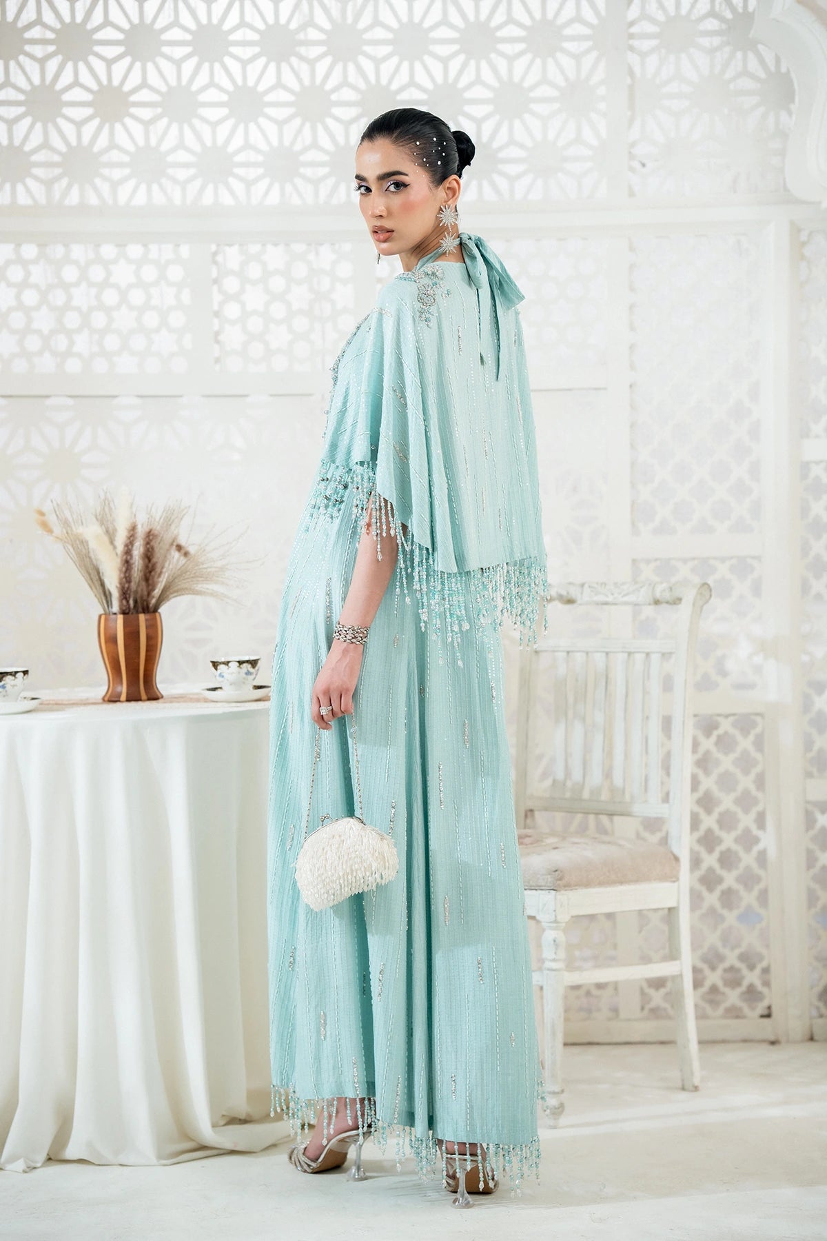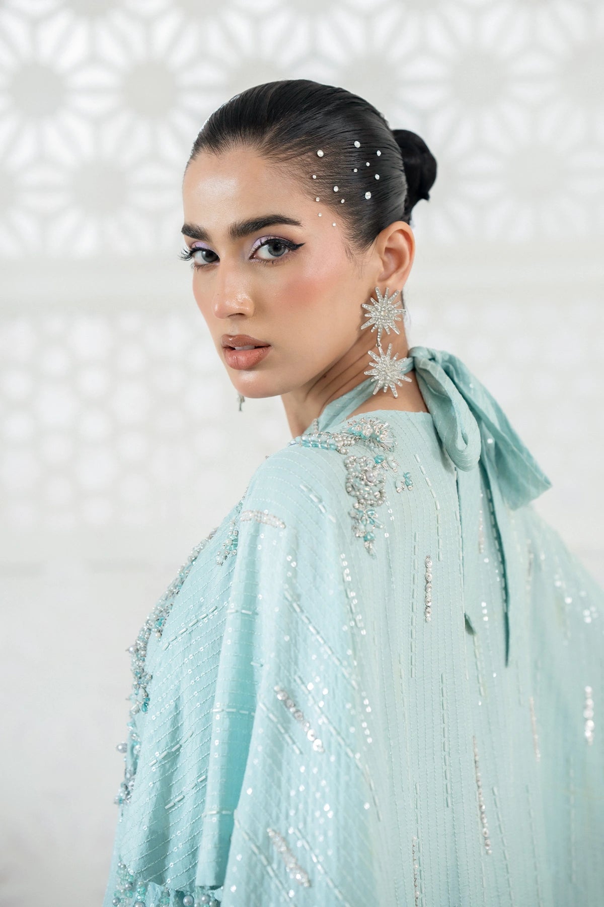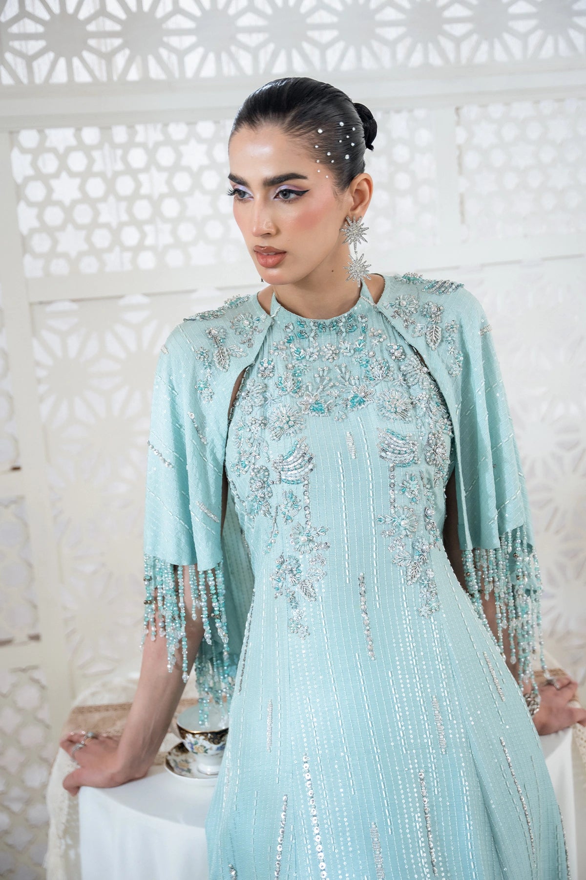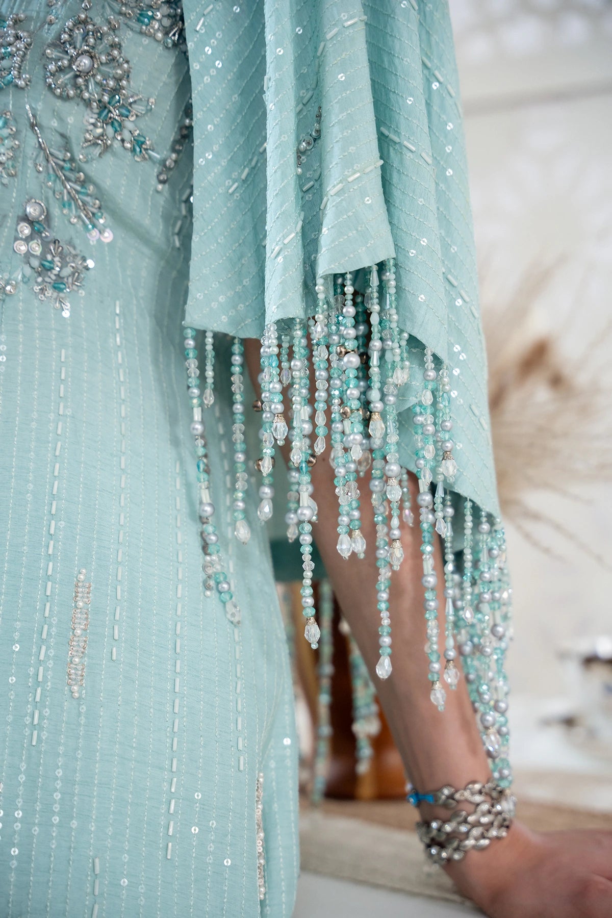 This halter-neck maxi in frosted teal is embroidered in sequined lines that elongate and define. Finished with hand-done embellishments and a strong silhouette, it carries both edge and elegance with ease.